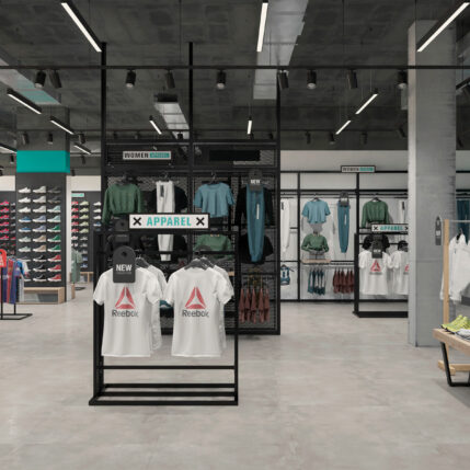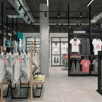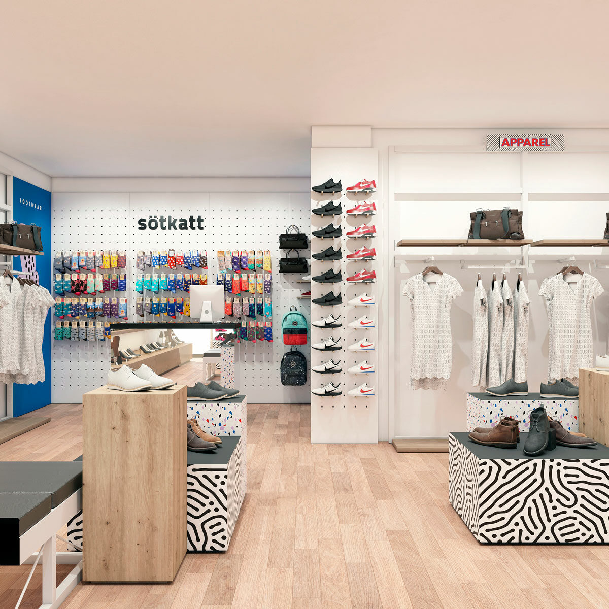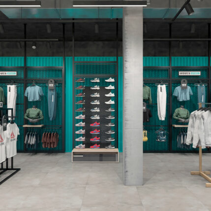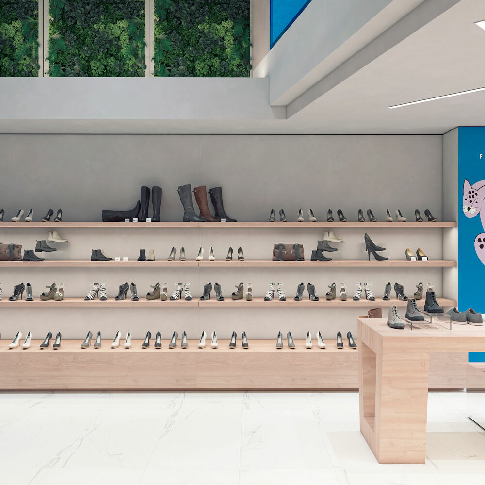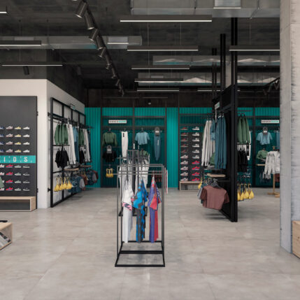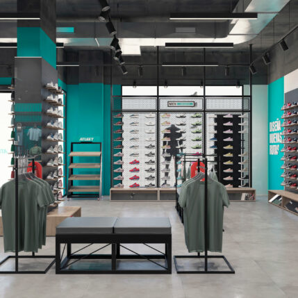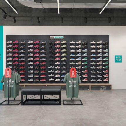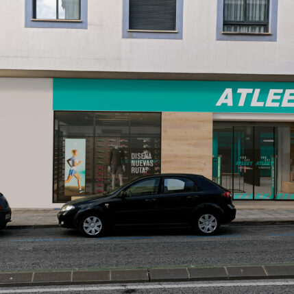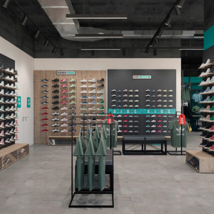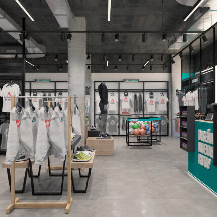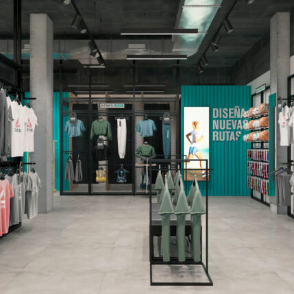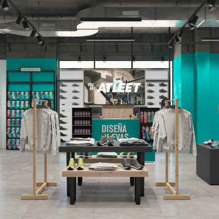 La tienda de deportes Atleet se caracteriza por su imagen fresca y dinámica, que refleja el espíritu de sus clientes. El color corporativo es el verde agua, que transmite tranquilidad y naturaleza. El suelo está revestido con porcelánico acabado hormigón, que aporta resistencia y modernidad. El mobiliario se realiza mayoritariamente en tablero melaminizado acabado roble, que crea un contraste cálido y acogedor con el suelo. Los paneles para zapatillas tienen un acabado gris sombra, que resalta los colores y las formas de los productos. La iluminación se realiza con proyectores y tiras led, que generan una atmósfera luminosa y atractiva.
