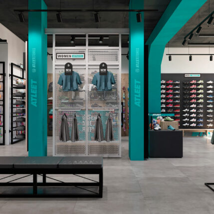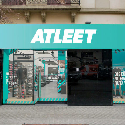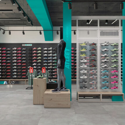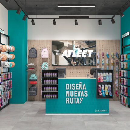 La tienda de deportes Atleet se caracteriza por su imagen fresca y dinámica, que refleja el espíritu de sus clientes. El color corporativo es el verde agua, que transmite tranquilidad y naturaleza. El suelo está revestido con porcelánico acabado hormigón, que aporta resistencia y modernidad. El mobiliario se realiza mayoritariamente en tablero melaminizado acabado roble, que crea un contraste cálido y acogedor con el suelo. Los paneles para zapatillas tienen un acabado gris sombra, que resalta los colores y las formas de los productos. La iluminación se realiza con proyectores y tiras led, que generan una atmósfera luminosa y atractiva.