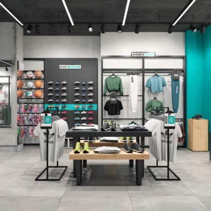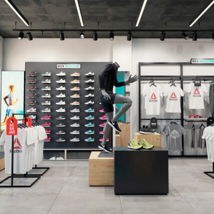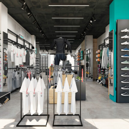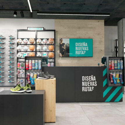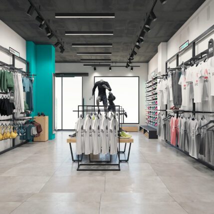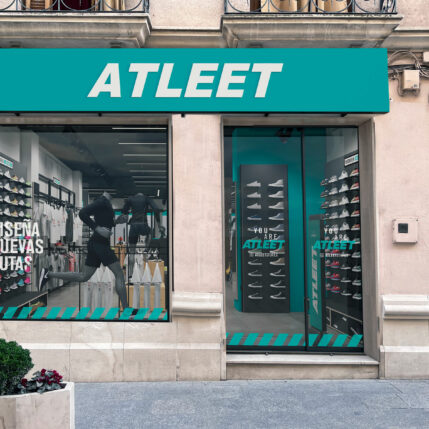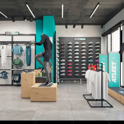 La tienda de deportes Atleet se caracteriza por su imagen fresca y dinámica, que refleja el espíritu de sus clientes. El color corporativo es el verde agua, que transmite tranquilidad y naturaleza. El suelo está revestido con porcelánico acabado hormigón, que aporta resistencia y modernidad. El mobiliario se realiza mayoritariamente en tablero melaminizado acabado roble, que crea un contraste cálido y acogedor con el suelo. Los paneles para zapatillas tienen un acabado gris sombra, que resalta los colores y las formas de los productos. La iluminación se realiza con proyectores y tiras led, que generan una atmósfera luminosa y atractiva.