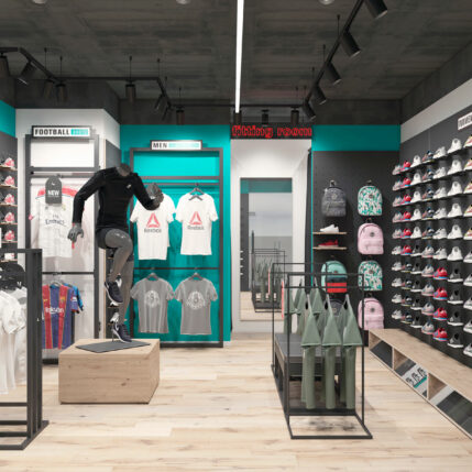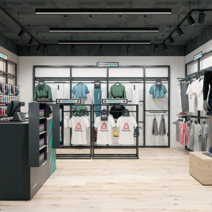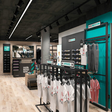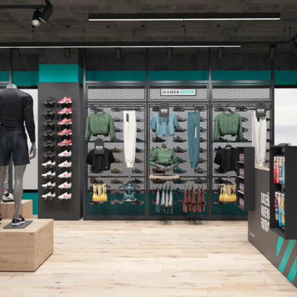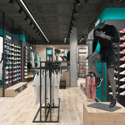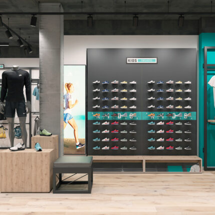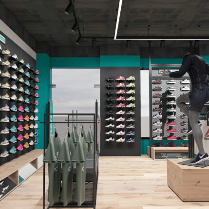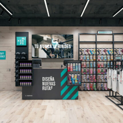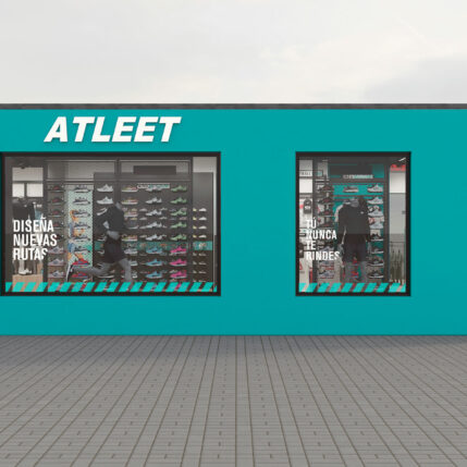 La tienda de deportes Atleet se caracteriza por su imagen fresca y dinámica, que refleja el espíritu de sus clientes. El color corporativo es el verde agua, que transmite tranquilidad y naturaleza. El suelo está revestido con porcelánico acabado hormigón, que aporta resistencia y modernidad. El mobiliario se realiza mayoritariamente en tablero melaminizado acabado roble, que crea un contraste cálido y acogedor con el suelo. Los paneles para zapatillas tienen un acabado gris sombra, que resalta los colores y las formas de los productos. La iluminación se realiza con proyectores y tiras led, que generan una atmósfera luminosa y atractiva.